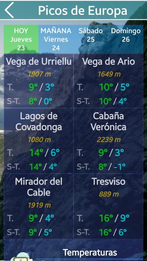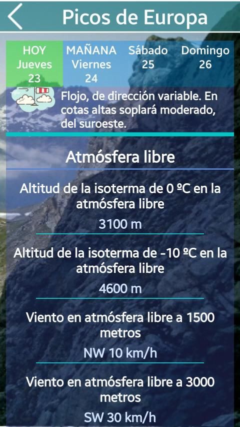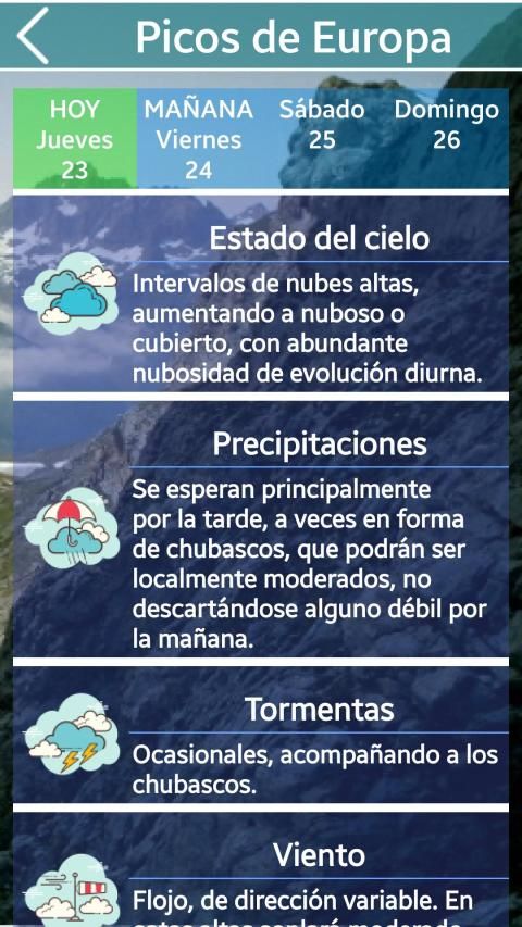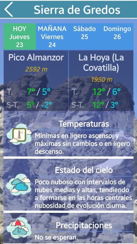 With the application Weather in the Mountain you can know the weather forecast in real time and continuously updated. Weather forecasts for today and the following 3 days with the following data: