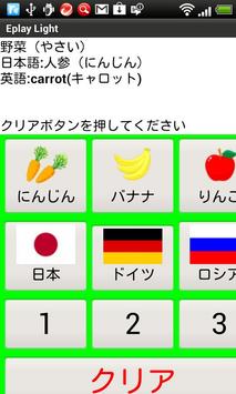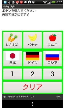 このアプリは、英語のネーティブ音声プレーヤーです ボタンを押すと、英語の音声が発音されます 対象年齢:5歳以上 このバージョンは、体験版に付き、発音する音声は全9種類 (野菜、果物、国旗、数字)です