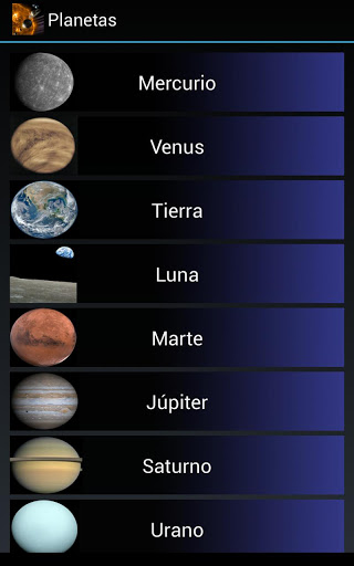 Planetas: donde obtendrás información detallada sobre cada uno de ellos además de la Luna. Dispondrás de una introducción, texto con imágenes, galería de fotos y para varios de ellos un apartado extra con su característica más llamativa.