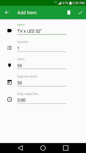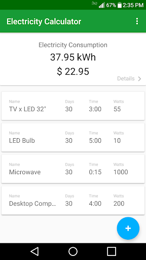 Electricity Calculator helps you to calculate the monthly electricity consumption of your home. Easily add your home appliances and devices or pick them from the list of samples.