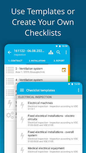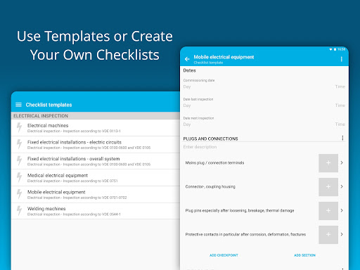 Included templates / checklists: Lightning protection systems, electrical machines, medical electrical equipment, fixed electrical systems - overall system, fixed electrical systems - circuits, mobile electrical equipment, installations, welding machines