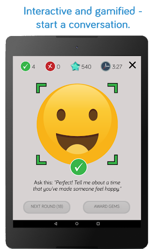 Emotion Charades -- A two-player, interactive emotion-recognition game. In this app, users tilt their head to choose the emoji that matches their partner’s expression, strengthening their emotional literacy. The two-player game creates a dialogue via prompts for the teacher/parent to read. Prompts assure deeper levels of emotional processing, and foster a connection with the student.