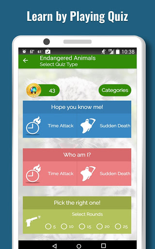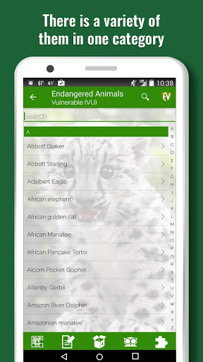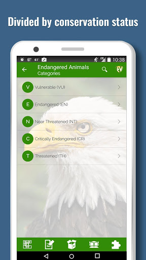 Endangered Animals is a guide to explore the animals that are threatened or endangered. They need love, care and protection. Know them, learn about them, spread the word around and be compassionate towards the cause to save them. They look so innocent and full of life .The app has information on more than 1600 Endangered Species under 5 broad categories from Vulnerable to Critically Endangered. The app has Categories, Picture Puzzle, Contribute, Quiz and Search.