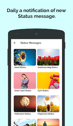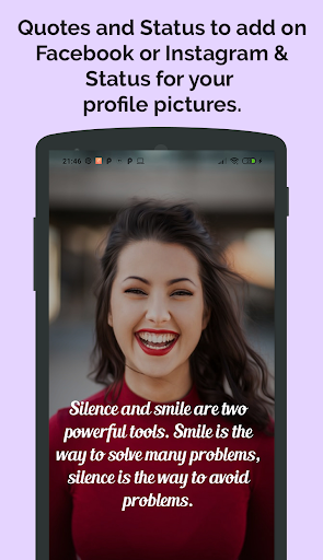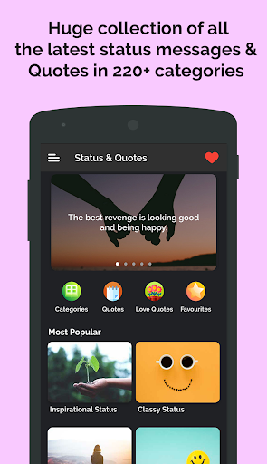Status Messages & Quotes app will provide you best the status ever that you can use and attract people by being funny or cool or awesome. Updating status or changing it from time to time simply defines your way of living life or style towards life. You can use these picture quotes and messages for Whatsapp status, Facebook story, Instagram captions and Selfie quotes for Your Photos and on other social media apps.