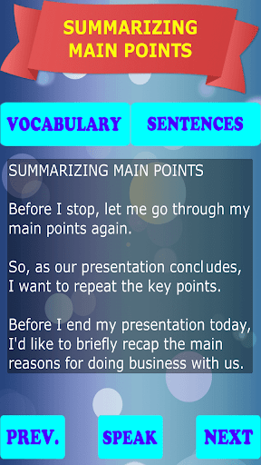 This app is not only to help you quickly learn English for presentations, but also to help you have a good preparation for successful presentations.