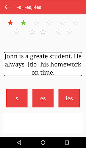 This application is build for those kids who want to learn and test them self for correct use of a, es, an, the, ies, has, have do, and, then , for , since etc..