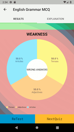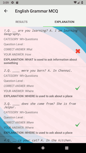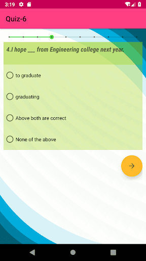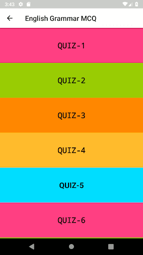 English Grammar MCQ application covers topics such as Quiz on Tenses, Gerunds and Infinitives Exercises, Wh-Questions and tag questions, pronouns, noun, articles, preposition, adjectives etc