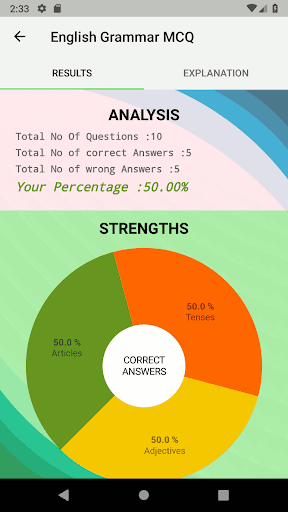 Each quiz has 10 questions after completing these questions there will detailed analysis shown with answers.