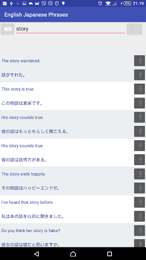 100 000 English Japanese offline phrases application enables you to search 100 000 phrases in both English and Japanese. For the searched word you will be given a set of phrases. This application is a great tool for learning both Japanese and English language. The phrases also have a text to speech capability, that will enable you to hear how the phrases are spoken.The application requires no internet connection and is free to use.