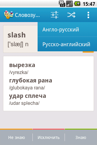 The developers have done their best to create an interesting and useful application. Install English Russian Word Swot onto your smartphone, it will help you to learn English easily, practicing at any time and place, whether you are on vacation at a beach, on a lunch break at work or at home before going to bed.