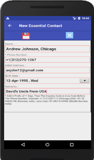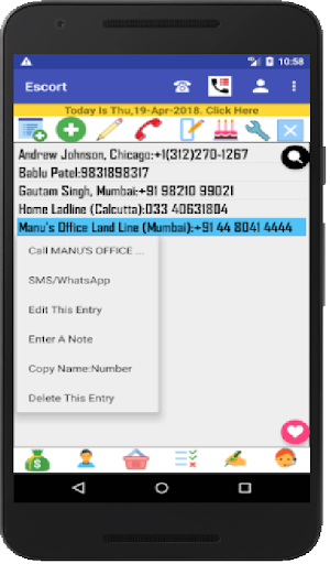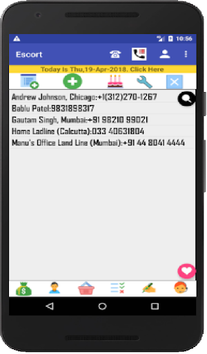 a) ESSENTIAL CONTACTS : These are your most important Contacts and are listed on the Main Screen. You can Import an Entry From Your Phone Contacts or Add One Manually. There is a Facility of Adding Notes/Activities for an Essential Contact. Birthday Reminders will be Flashed When ESCORT Starts.
