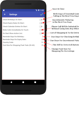 9. Action List : All the Items Of Shopping List And Task To-Do Are Listed Here. This Shows Up At The Start Of ESCORT If Customized Under "SETTINGS".