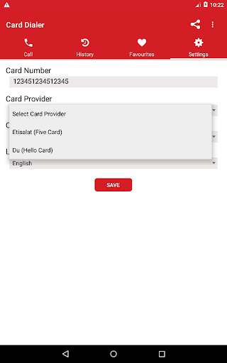 - Settings Screen: select Etisalat or Du ,Card Pin Number, Language Selection , Country selection.