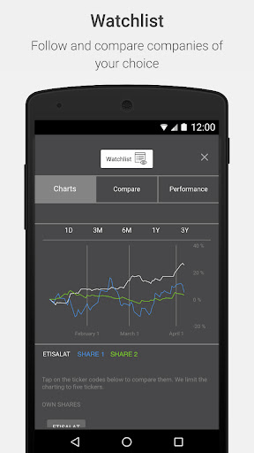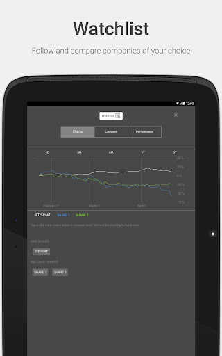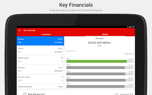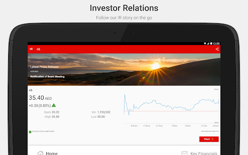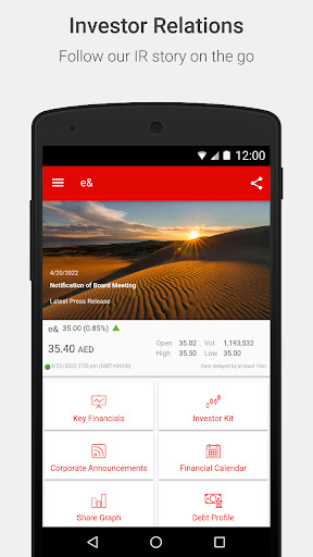 The e& Investor Relations app will keep you up-to-date with the latest share price data, stock exchange and press releases, IR calendar events and much more.