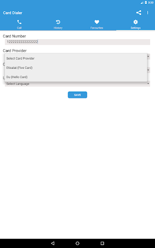 - Settings Screen: select Etisalat or Du ,Card Pin Number, Language Selection , Country selection.