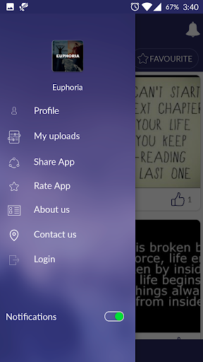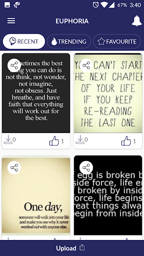 Euphoria - Quotes and wallpapers is a collection of carefully picked quotes with images to inspire you at every stage of life. You can like, download, upload images and share them with your friends, family and followers. Favorites section includes quotes liked by you. On Euphoria you will find quotes and wallpapers for love, friendship, inspiration, spirituality, ambition, motivation etc.