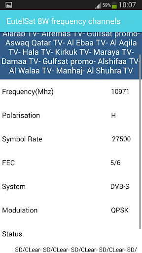 • Detailed information for each channel (frequency - Polarization - SR -FEC -Modulation -System - Channel Status (SD or HD / encrypted or Clear).)