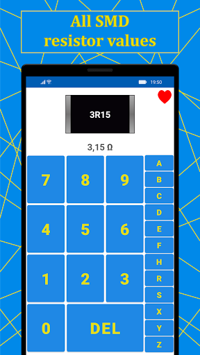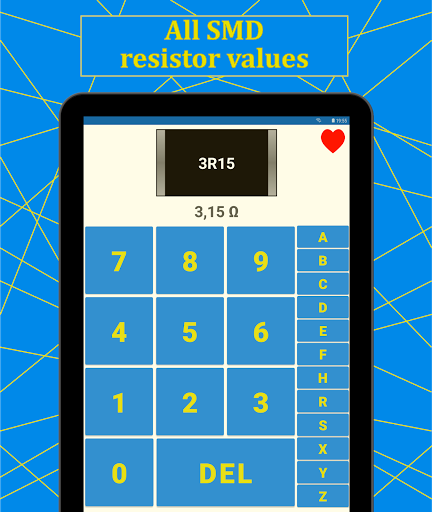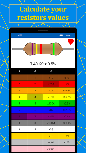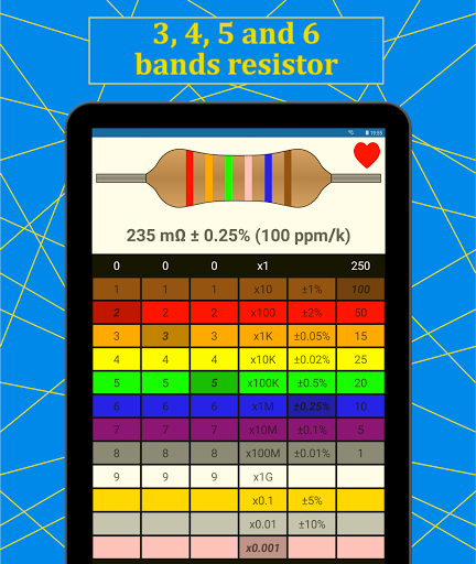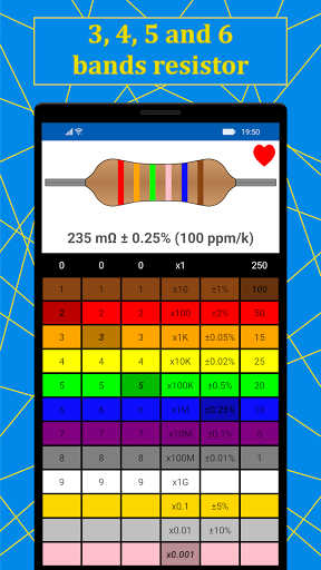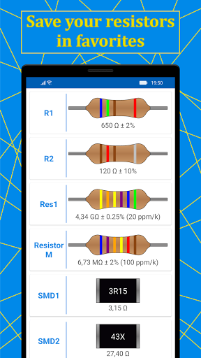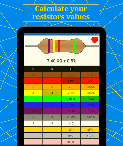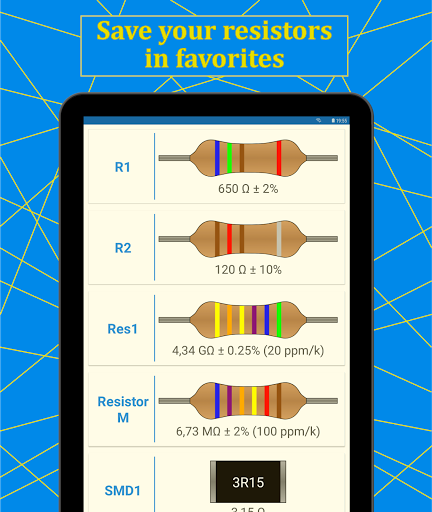 Calculate values of Every Resistor in ohms easily with this app. Choose between 3, 4, 5 and 6 bands and pick the colours of the resistor while seeing the value changing. You can also calculate the values of every SMD resistor and add your resistors to favourites and always have them in that section.