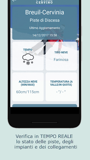 I dati della APP sono sempre aggiornati dinamicamente via internet, per avere informazioni costantemente aggiornate su quello che succede nella Valle del Cervino. Inoltre l’applicazione è comunque navigabile anche in modalità offline.