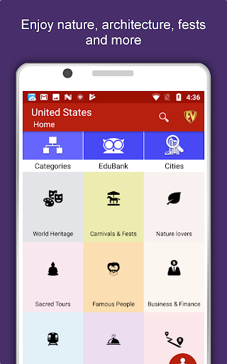 Apart from this, United States Travel & Explore guides you Why, When and How to visit various places in United States with precise location on the detailed Map. There are three ways to explore this app - Category view, City view and EduBank favorite places view. Pin your destinations and get the routes on the Map. Not only this, you can see exactly how the places look like with Street View integrated in this app. The app also has a feature to Rate and write Review/Experience regarding entity(s) through Login. Your Travel experience and rating will help the user community.