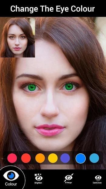 Enhance the look of your photo by changing eye color, enlarging and brightening it, removing the dark circles, with this eye color changer app and eye color editor app.