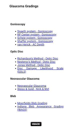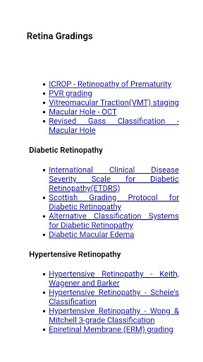 Clinical Ophthalmology grading and staging systems for ophthalmology residents and ophthalmologists. Has both Searchable list and Grouped under Cataract, Glaucoma, Retina, Cornea and so on.