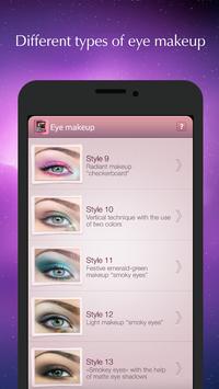 In the app, you will find various eye makeup options (smokey eyes, permanent, daytime and evening options for hazel, green, blue, and other color eyes) with detailed step-by-step lessons on applying make up with pictures and text accompanying each option.