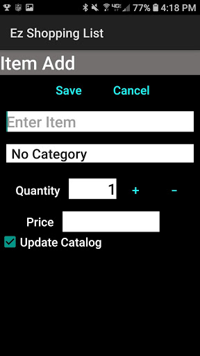 Easy Entry: Screen layout allows for the quick and easy entry of an item. Simply enter an item and hit the save button. No scrolling is involved. Additional information can be entered such as category, quantity, and price.