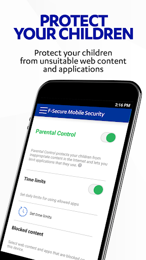 Protect your children from inappropriate websites with parental control, which lets you moderate their online life. Easy to install and use without slowing down your device, F-Secure Mobile Security will protect you.