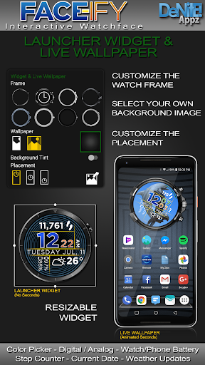 This completely customizable interactive HD Android Wear / Wear OS Watch Face, Clock Widget & Live Wallpaper brings a classic elegance to your wrist and Launcher. Features include custom complications, battery levels, weather conditions, step counter, color picker & date information. A settings app will also be installed on your mobile device to configure the watch face for any look you desire. Select any color and create a completely custom look for yourself! Don't have an Android Wear watch? No Problem! You can use the clock widget or Live Wallpaper on your launcher!