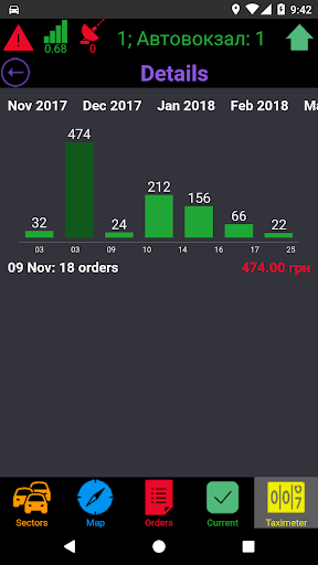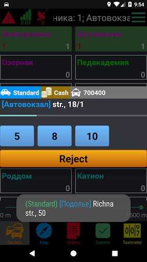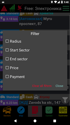 - Working in free air with the ability to filter orders at the starting points, end points, distance to the order, payment types and tariffs.
