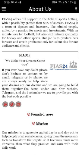 FIAS24 Ltd. is a professional company that was created with helping people generate profits and produce gains from sport betting across the world. We are professional analysts with more than 15 years in the investment and sport betting fields.