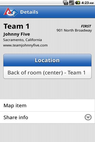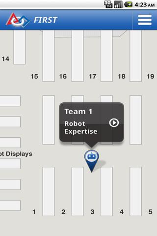 Locates participating team restrooms and food at the FIRST Robotics competition directly on the floor map.