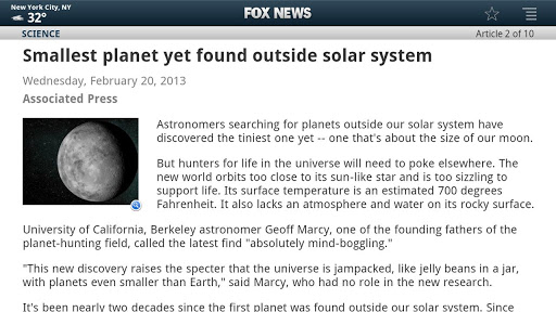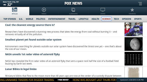 Introducing the first and only news application for Google TV from the #1 name in news, the FOX News Channel.With the FOX News Android App - receive FOX News Alerts, read headlines news stories, stream the latest video clips, listen to FOX News Radio, and browse through photo galleries all for FREE!Video· Get the days top news stories from FOX News’ videos on demand.Also enjoy top videos from all your favorite weekday shows.Shows· View the latest videos from the #1 cable news shows and anchors on the FOX News Channel. Share / Save· Articles, photos and videos can be shared with friends via facebook or Twitter, and can be saved to Favorites for viewing later.We report You Decide®... On-The-Go!