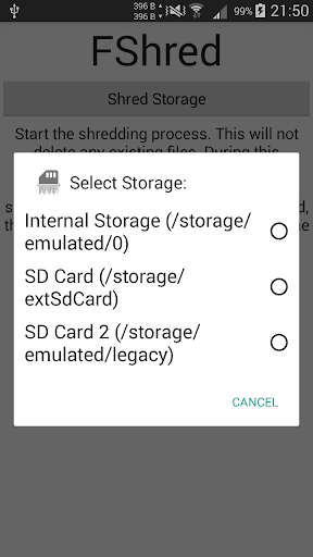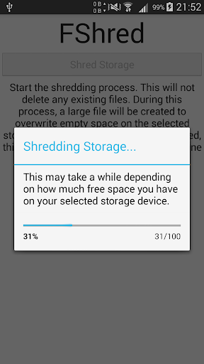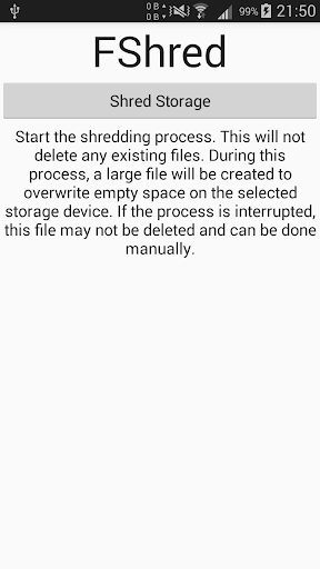 FShred is a simple, handy app that makes deleted files on your internal storage unrecoverable by overwriting all available space with random data. This means recoverable data from deleted files, such as images, videos, databases, is replaced with useless bytes supplied by a random generator.