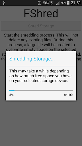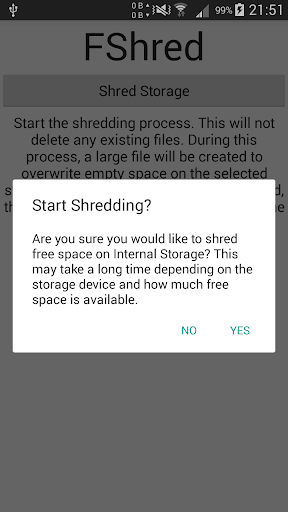 Please Note: This app does not delete ANY existing files when 'shredding' your internal storage. Your existing data will be unchanged throughout and after the process.