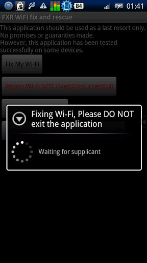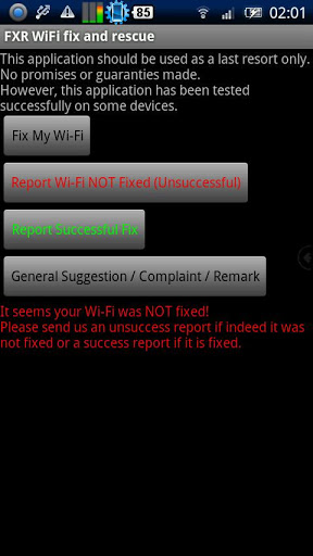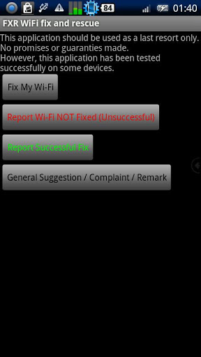 Fixes a malfunctioned wifi Factory reset? Try this app firstFXR is the ultimate WiFi healer fixer, it is a very light and simple yet powerful rescue application which can fix a malfunctioned or problematic WiFi.It just might succeed where other apps have failed.Currently 12092012, according to the success vs unsuccess reports our success rate is 52 out of total reports.Having a WiFi problem ? Your WiFi stopped working or seems broken?If you are about to do a factory reset try this application first, it might heal your deviceNo promises made, no guaranties, but it has been tested on some devices with a malfunctioned WiFi which otherwise required factory reset and fixed the problem.Here is the current list of devices which success reports were sent on:HTC Desire HD Evo G1 Glacier Hero Magic Legend G2 OneMotorola Droid MilestoneNexus OneSamsung GTi5510 GTi5700 GT5800 GTi9000 GTi9000M GTP1000 SPHM900 SGHi896 SGHi897 SGHT959 SHWM110S SHWM130 SPHD700 SPHM900 SPHM910 SPHM920 S S2 S3Sony Ericsson E15i X10iHUAWEI M860Unlike other WiFi fix applications it does not run as a service on the backround, it does not add any cpu load, it does not consume your battery Just one click activate it, let it do its magic, wait for a few seconds up to about one minute and thats itPlease note if your hardware is broken there isn39;t any software which can fix that. This app solves problems in android OS which cause the WiFi to stop working properly.It is recommended installing this app now that your WiFi does work so it will be available if WiFi stopped working and your 3G is expensive.Fixing wifi is just the first phase in the near future we plan to add GPS and bluetooth fixing.