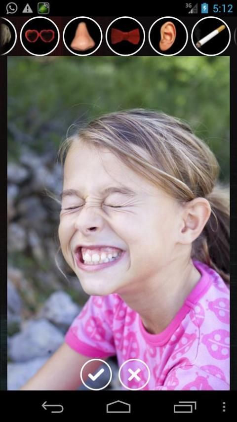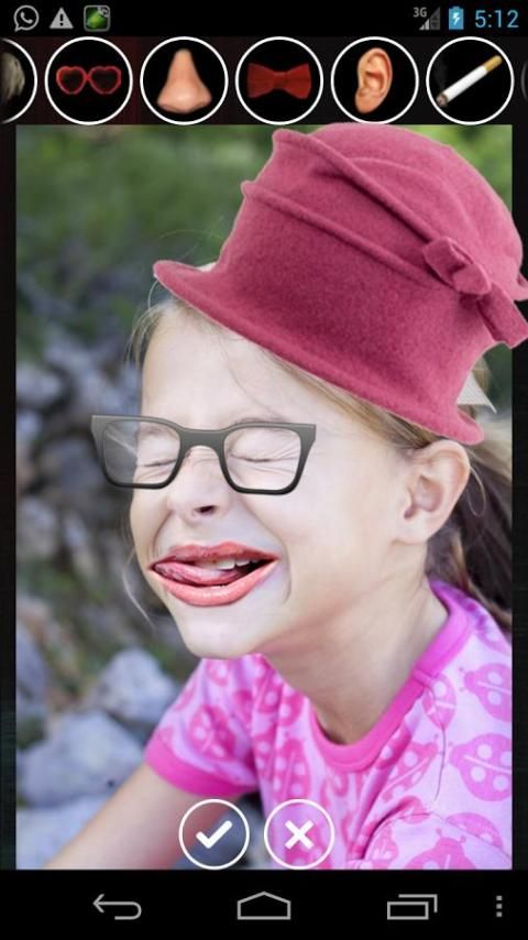 It's very easy to create funny pictures and photo effects, save them and you can then share them. The app comes with different objects, like mouth, moustache, glasses, ears, eyes, etc. ,sunglasses , cap, hair ,nose, tie , scarecrow , scorpion clown , ostrich ,and many images horror..