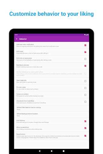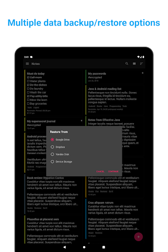 • Backup/restore notes using Google Drive, Dropbox, Yandex Disk, WebDAV or Device Storage