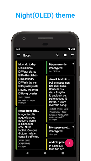• Protect notes with AES-256 encryption; encrypted notes stay encrypted in filesystem and backups; if title and content both are present, only note's content gets encrypted and the title stays plaintext