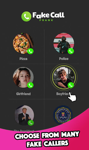 - Choose your favourite from a list of many fake callers - like girlfriend, police, pizza