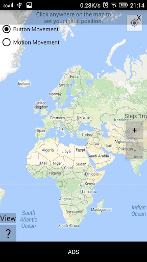 This method enables you to change your location without any button. You just tilt your device forward for North, right for East, backwards for South and left for West. You can even use combinations like tilt forward and left to go North-West. Finally, you can shake your device in order to pause and unpause motion movement functionalities (very useful when motion sensors are also used by other apps).