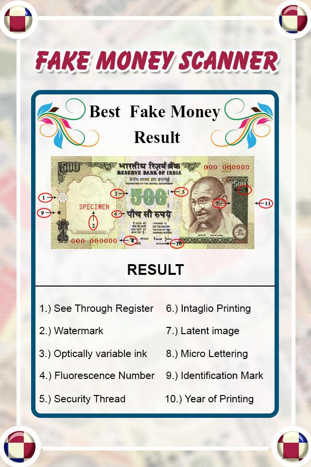 This app helps you to detect Fake Money. This is funny Prank to Fool your Friends. This app will make them that your Phone will scan for Fake Money. But it is not possible with Any Mobile phone now. This is Prank and for fun.