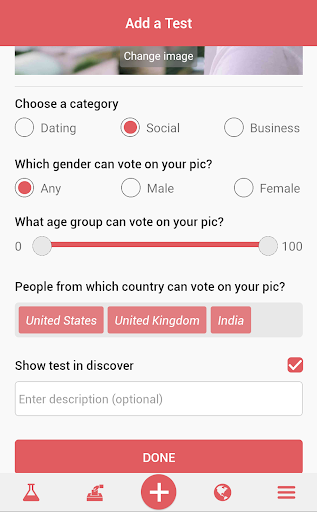 Get feedback on your pictures from all over the world by getting votes from your choice of community. Also set your voting preferences like gender, age and region. Check your photo feedback results using our highly analytical UI and tools. Optionally, showcase your best to the world using our Discover tool and be more famous and visible to the world. Get ranks on your pictures and check your Famous Index (FI) to see how you fare in your region or all over the world.