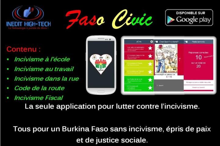 "FASO CIVIC" is the only sensitizing mobile BURKINA, very useful, containing a collection of acts of incivility to avoid making the difference between good and bad actions with the ultimate goal to instill in the minds of the Burkinabe fundamental notions of citizenship, which often ignore the acts to avoid for Burkina Faso without incivility, peace-loving and necessary social justice for Security and sustainable development.