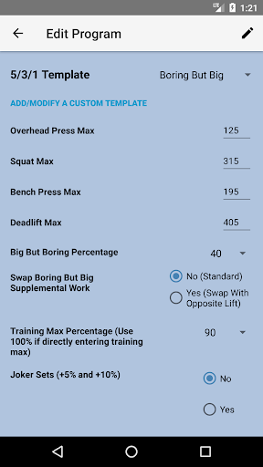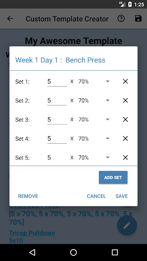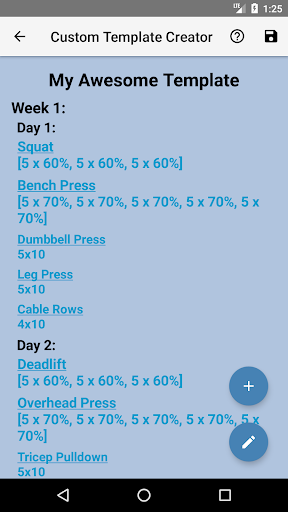 Choose one of the popular variations already loaded on the app or create your very own custom template and enter your maxes to generate your workout program. This app gets rid of the inconvenience of creating spreadsheets to keep track of your workouts.