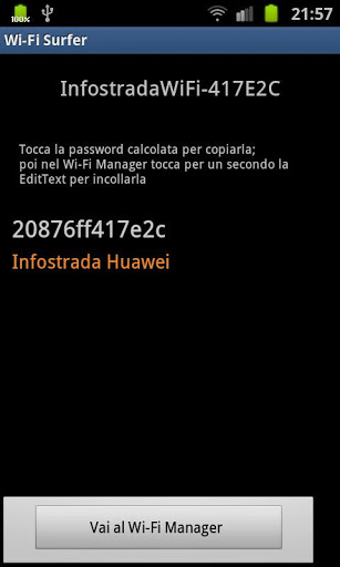 Questa applicazione Calcola la password Di default del wifi di alcuni modem forniti da Fastweb e Telecom.Non Funziona con tutti i modelli e se la password viene cambiata.E39; intesa come applicazione per recuperare una eventuale password smarrita, e non per entrare nella rete del vicino di casa :Non vi nessuna garanzia che funzioni, infatti gratuita,tuttavia se le condizioni necessarie si verificano, non ha mai fallito.Provatela e mandate un feedback.