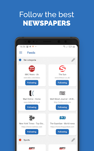FeedsNews will offer by default the best known newspapers from your country of origin, but you can modify it at any time, so if you are interested in knowing the news from countries such as Brazil, America, Canada, Germany, France... being a resident of Spain, you will be able to do so, something that does not happen with other Apps in the sector, which do not allow you to access the news if you are not a resident of that country. With our complete breaking news application you will have access to all the privileged information from the first minute of its publication.