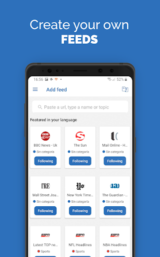 FeedsNews is the best rss reader that will allow you to be informed of all the latest news happening around the world. Enjoy international, national and local news from the palm of your hand, being able to know first hand and from official sources, real global news in real time and with personalized feeds.