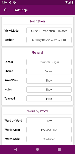 - Ability to show/hide Word by Word, Quran Translation (Tarjuma) and Tafseer